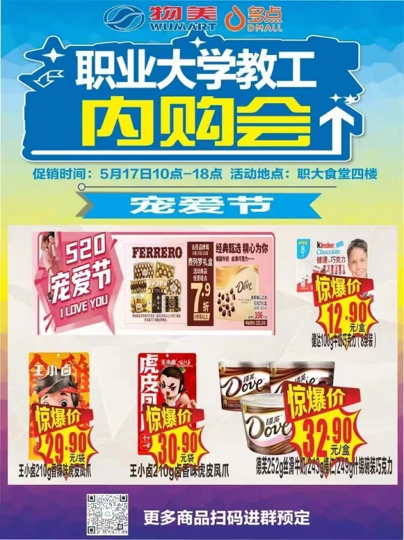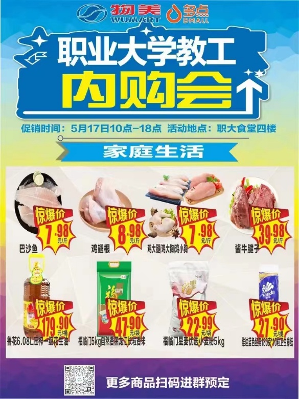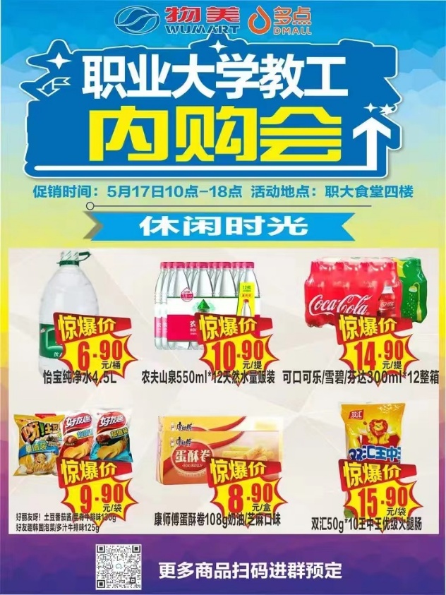 为进一步提升校园商业服务师生员工的能力,拓展校园商业服务渠道,满足师生员工多元化需求。校工会、后勤处联合学校超市服务单位天津物美便利有限公司,于2023年5月17日(周三)10:00-18:00在北辰校区食堂四楼举办天津职业大学教工内购会活动,为广大教职工提供质优价廉的购物福利。